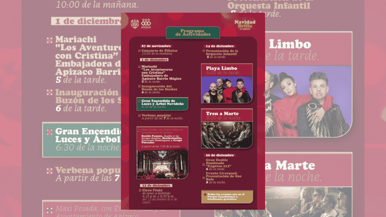El Gobierno de Apizaco invitó a toda la población a participar y disfrutar de esta temporada decembrina, destacando que todos los eventos serán gratuitos, abiertos a la ciudadanía y enfocados en fomentar la convivencia, la unión familiar y la recuperación del espacio público.